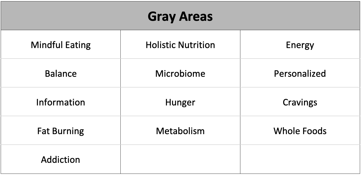 The Gray Areas of nutrition have some merit and at their core are probably good principles but have been slightly exaggerated or misrepresented. Whereas the Turn Offs/Triggers are almost entirely focused on the positive aspects of food (what you can get by eating them), the gray areas of nutrition are a little more focused on some of the “bad” aspects of food and what you can do to fix them. They are also focused on the food AND the individual. The words in this category actually really exist and can be found in the academic literature.