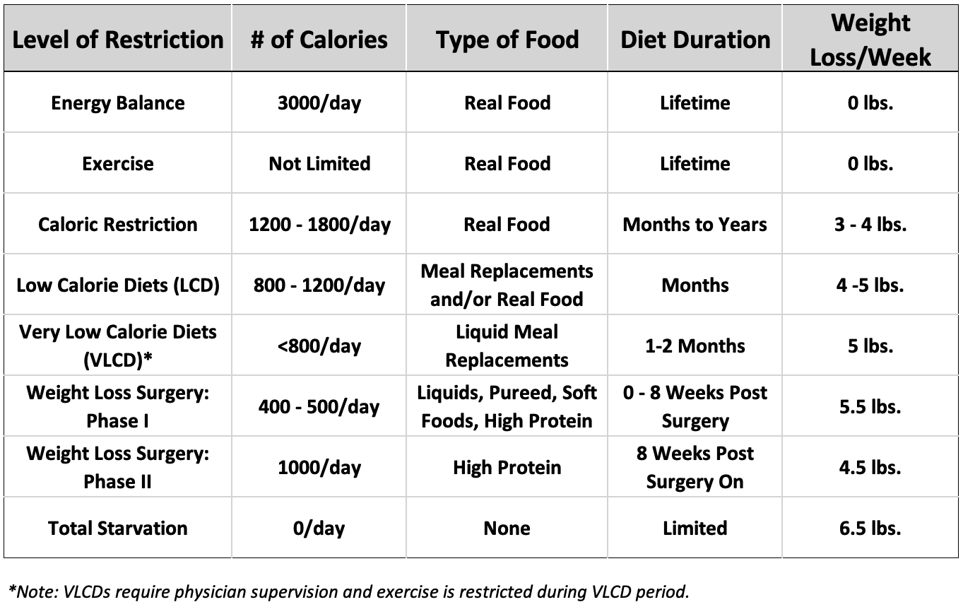 The more calorically restrictive the diet, the more weight you are going to lose. Outside of weight loss (bariatric) surgery and medications, a very low-calorie diet (VLCD; < 800 calories/day) is going to lead to the greatest rate of weight loss and total amount of weight loss over time.