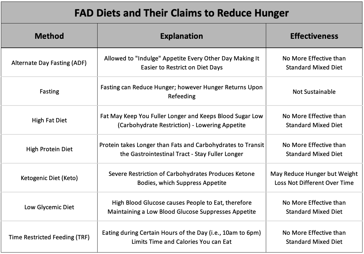 Table 1. An Overview of the Diets that Supposedly Reduce/Control Hunger, an Explanation of Why They Purport to do So, and the General Effectiveness of Each.