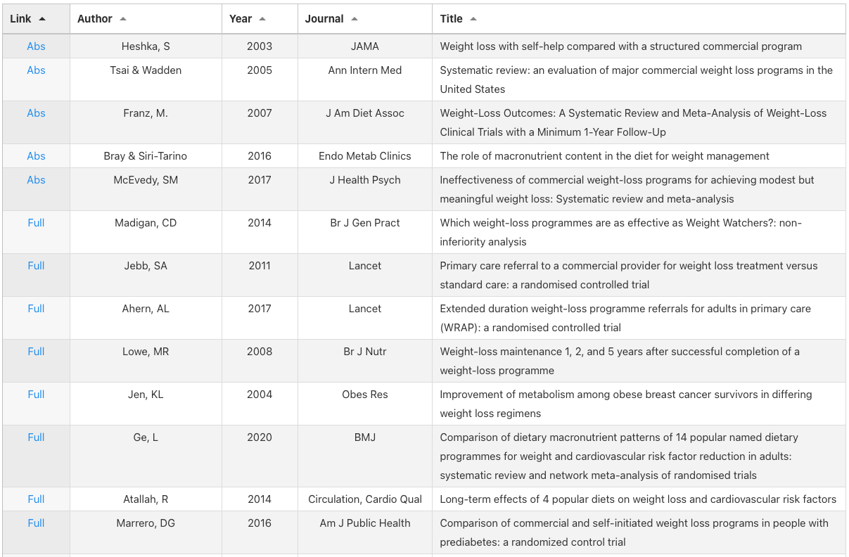 The lack of Weight Watchers success wasn’t for a lack of trying. They, out of anyone, have some of the best researchers and research done on any weight loss program. I’ve compiled a list of most of their electronically available studies in table 1 below.